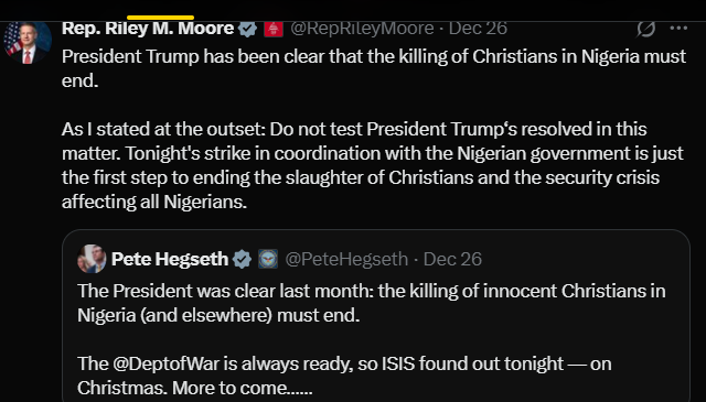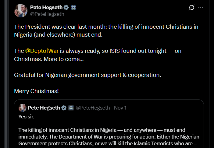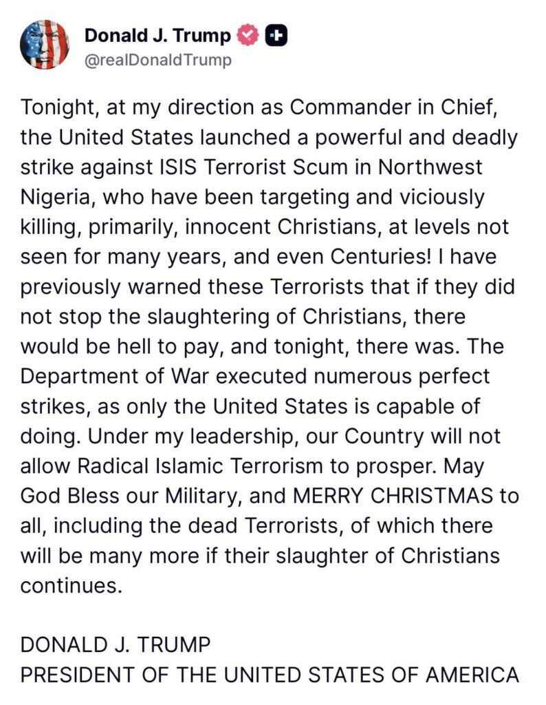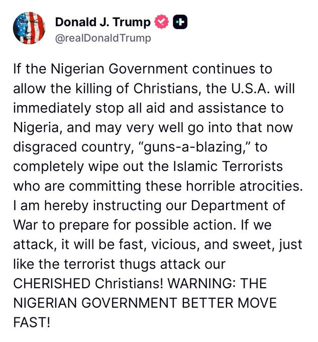 Trump announced the action on Truth Social, linking it to recent attacks on innocent Christians and warning of more consequences.