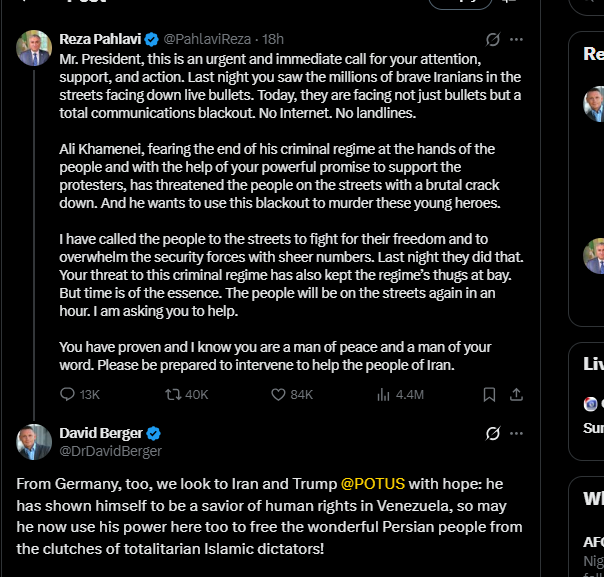Exiled Crown Prince Of Iran Reza Pahlavi, Calls President Trump’s Attention To Iranians’ Plight, Pleads With Him To Act Fast After US Promises To Come To Their Rescue.