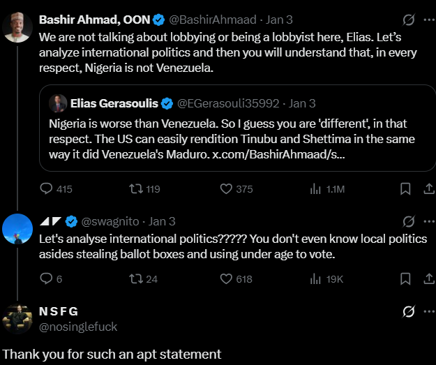 Gerasoulis over the weekend, responded to Ahmad post that partly read: “Nigeria is not Venezuela. We are different in every respect.”