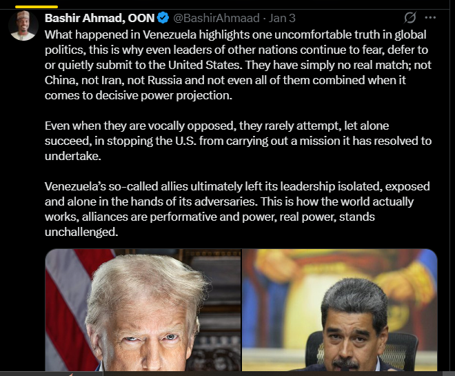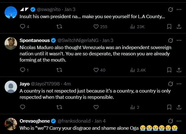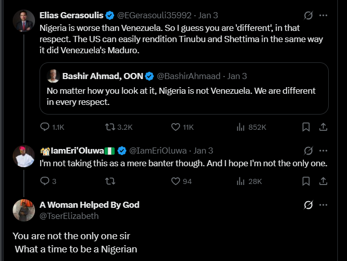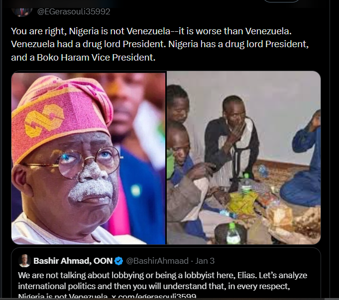 However, Gerasoulis begged to differ, pointing out that: “Nigeria is worse than Venezuela. So I guess you are ‘different’, in that respect. The US can easily rendition Tinubu and Shettima in the same way it did Venezuela’s Maduro.”
