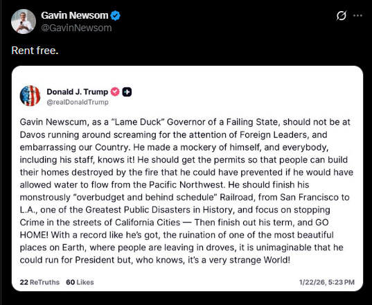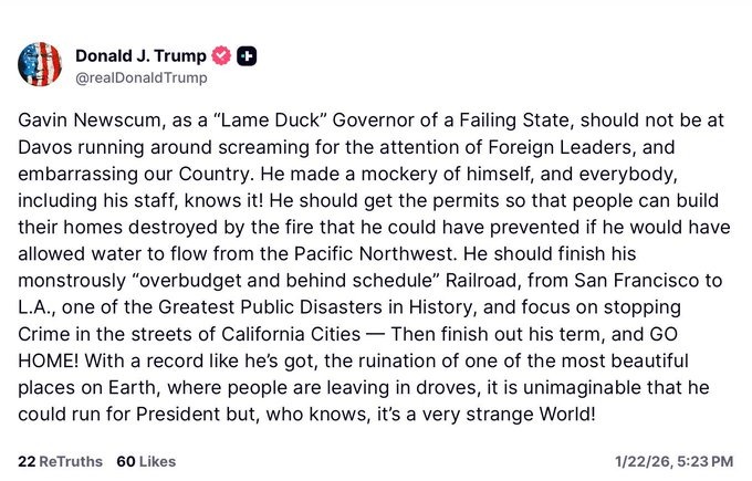 • Gavin Newsom Responds To President Trump’s Rage Over His Appearance At Davos, Describes Him As “Lame Duck” Governor Of A Failing State.’ January 23, 2026