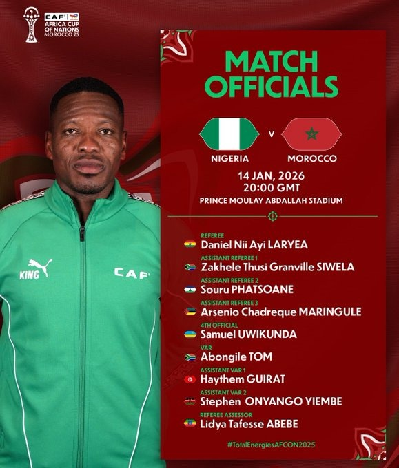 NewsSportsGhanaian Referee Daniel Laryea Will Officiate Nigeria Vs Morocco Match On Wednesday, With Tom Abongile On VAR20 by thesubstancenewsJanuary 13, 2026January 13, 2026