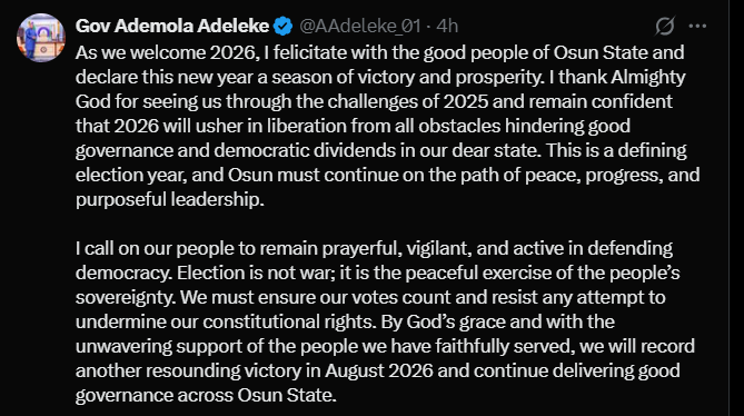 NewsPolitics and PolicyGovernor Ademola Adeleke Urge Osun State Residents To “Remain Prayerful, Vigilant, And Active In Defending Democracy.”10 by thesubstancenewsJanuary 1, 2026January 1, 2026