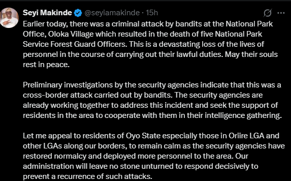 NewsPolitics and PolicyGovernor Seyi Makinde Releases Statement On The Killing That Involves Five At The Old Oyo National Park Service Post, Confirm It Was A Cross-Border Attack Carried Out By Bandits.50 by thesubstancenewsJanuary 8, 2026January 8, 2026
