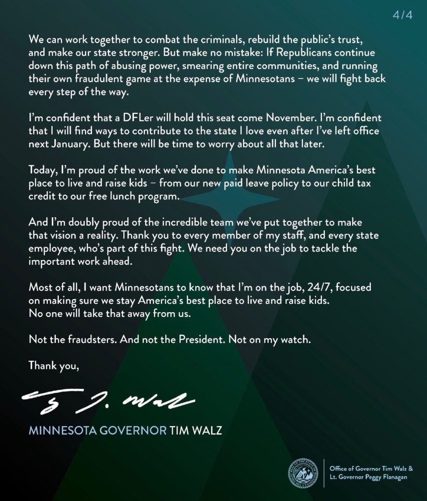 NewsPolitics and PolicyMinnesota Governor Tim Walz Bows Out Of The 2026 Gubernatorial Race Over Alleged Somali Scandals Exposition, List Odds Stack Against His Political Ambition30 by thesubstancenewsJanuary 6, 2026January 6, 2026