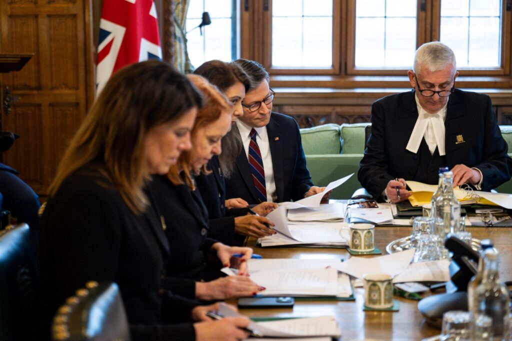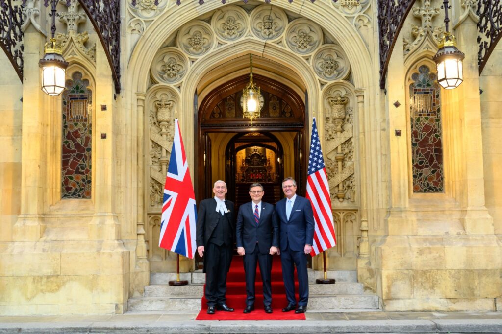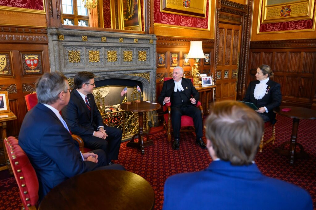 UK House of Commons Speaker, Sir Lindsay Harvey Hoyle at the parliament welcomes speaker of the United States House of Representative Mike Johnson in celebration of America’s 250th independence anniversary.