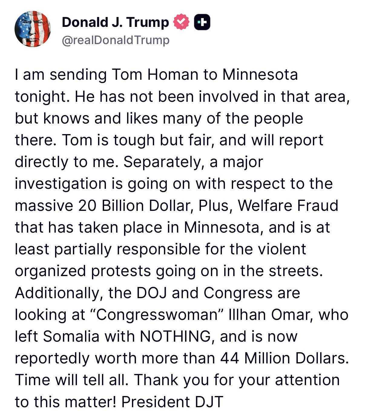 President Trump To Send Border Czar Tom Homan To Minnesota, For Investigation Into Alleged Fraud And Somali Congresswoman Whose Worth More Than 44 Million Dollars.