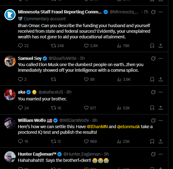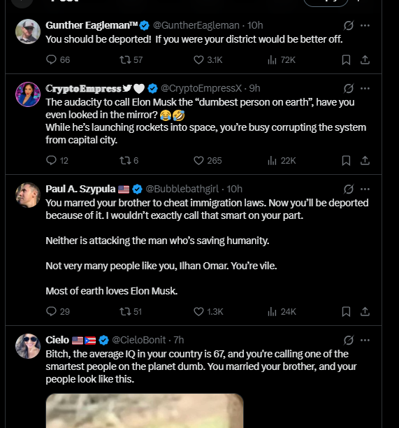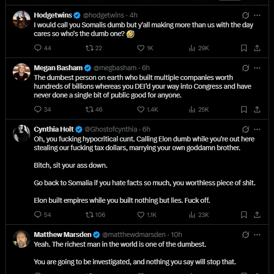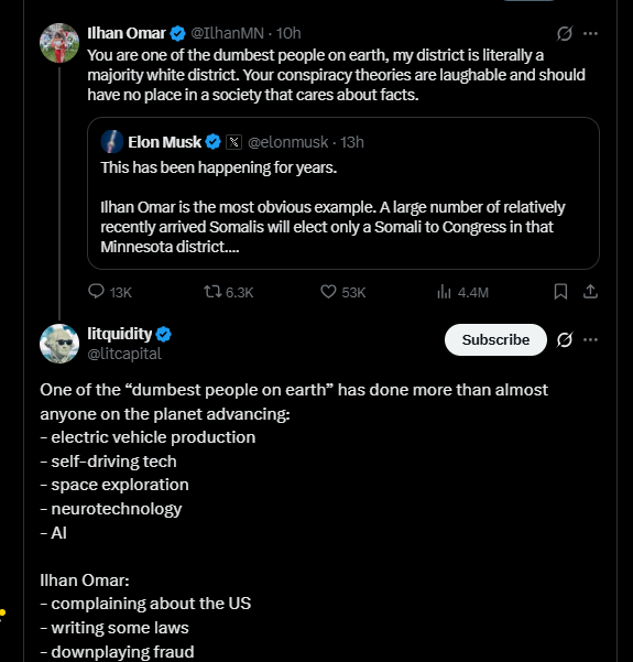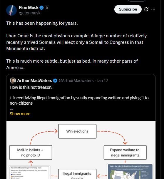 Crime and JudiciaryNewsSomali U.S Rep Ilhan Omar Accuses Of Fraud Calls Tech Billionaire Elon Musk ‘Dumb’ Over His Criticism Of Incentives Given To Illegal Immigration By Expanding Welfare, Bypassing Citizens.00 by thesubstancenewsJanuary 13, 2026January 13, 2026