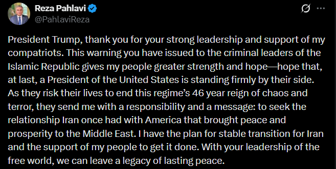 NewsPolitics and PolicyThe Exiled Crown Prince Of Iran Reza Pahlavi, Commends President Trump Warning To Iranian Leaders, Says It Gives Greater Strength And Hope To His People.40 by thesubstancenewsJanuary 3, 2026January 3, 2026