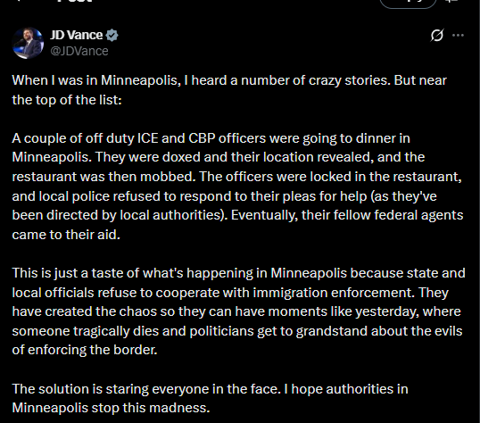 US VP JD Vance, Sites Instances In Nurse Shooting, Claims “State And Local Officials Refuse To Cooperate With Immigration Enforcement.”