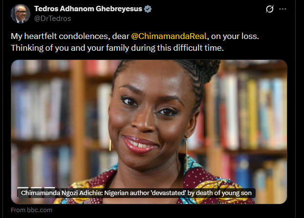 Director-General Tedros Adhanom Ghebreyesus Condoles: “My heartfelt condolences, dear @ChimamandaReal, on your loss. Thinking of you and your family during this difficult time.”