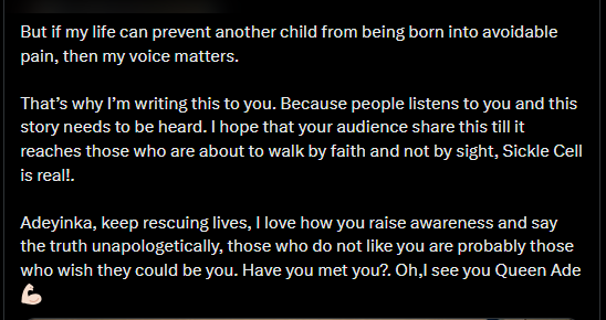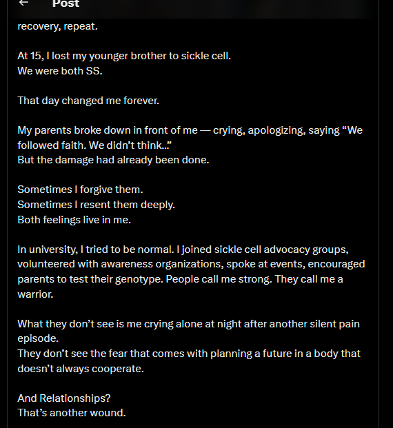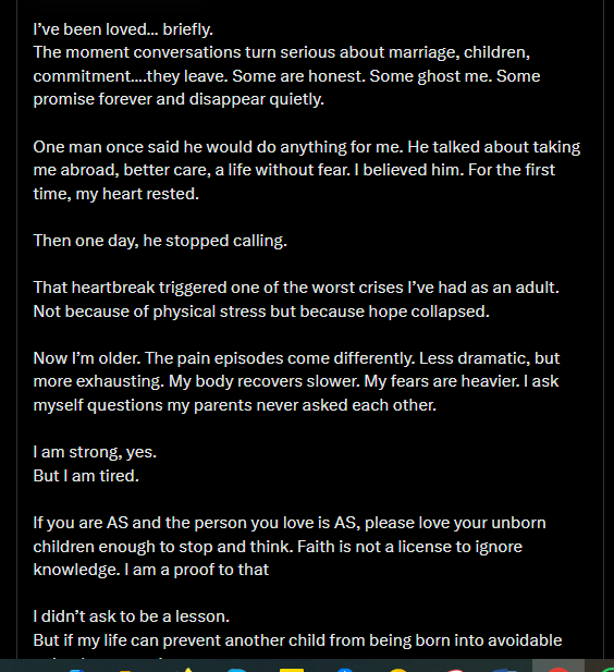 X Story: Lady Living With Sickle Cell Advocates Against As And As Genotype Marriage, Blame Her Parent For Their Blind Religious Belief That Kills Her Junior Brother And Makes Her Suffer.