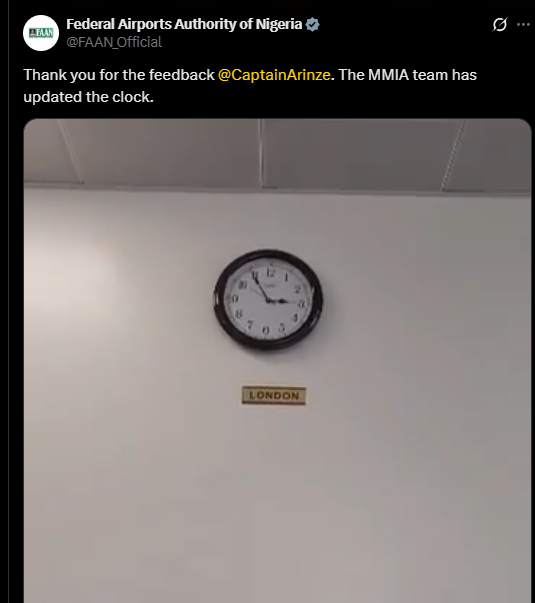 FAAN: “Thank you for the feedback @CaptainArinze. The MMIA team has updated the clock.”