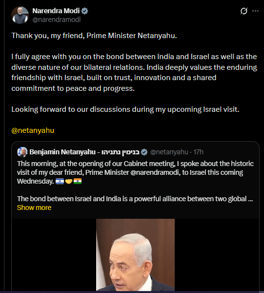 “I fully agree with you on the bond between India and Israel as well as the diverse nature of our bilateral relations. India deeply values the enduring friendship with Israel, built on trust, innovation and a shared commitment to peace and progress.