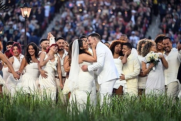 About five minutes into the 13-minute extravaganza at Levi’s Stadium, the latter part of a wedding ceremony was shown, with a smiling officiant declaring the couple married, and the husband and wife, both wearing white, shared a kiss as dancers and musicians surrounded them and smiled.