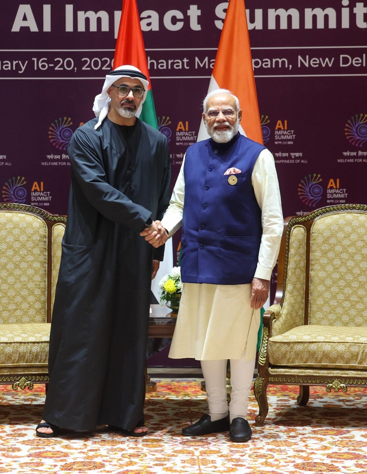 Prime Minister narendra Modi; “Had a fruitful discussion with His Highness Sheikh Khaled bin Mohamed bin Zayed Al Nahyan, Crown Prince of Abu Dhabi on the sidelines of the AI Impact Summit in Delhi. We talked about boosting cooperation in futuristic sectors such as AI, supercomputers, investing in data centres in India and more.”