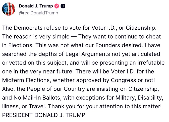 President Trump Claims The Democrats Refuse To Vote For Voter I.D, Accuses Them Of  Wanting ‘To Continue To Cheat In Elections.’