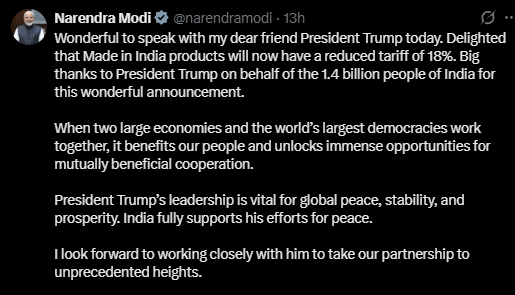 Prime Minister Narendra Modi Claimed Donald Trump’s leadership is vital for global peace, stability, and prosperity after the US President agrees to cut tariffs on India after it stop buying Russian oil.