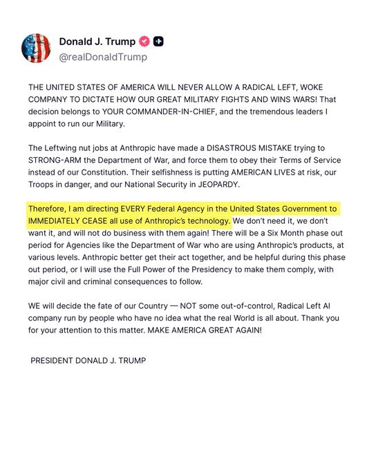 “The United States Of America Will Never Allow A Radical Left, Woke Company To Dictate How Our Great Military Fights And Wins Wars!”—President Trump Declares
