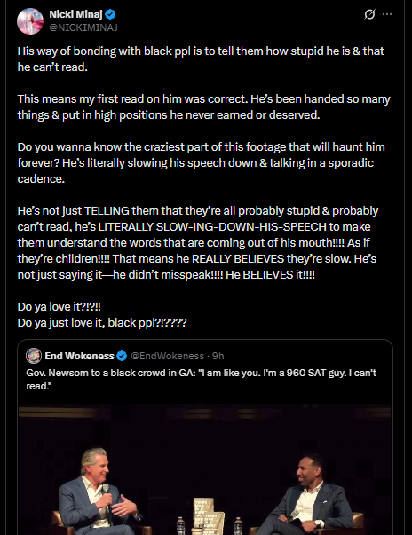 Trinidadian Rapper Nicki Minaj Criticizes Californian Governor’s Speech To A Black Crowd In GA, Inserts That Gavin Newsom ‘REALLY BELIEVES’ Blacks Are ‘Slow.’