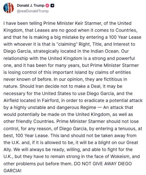 US President Trump Highlight The Effect Of British Prime Minister Leasing Out Chagos Island, Declares It Will Cause A Rift In Their Relationship
