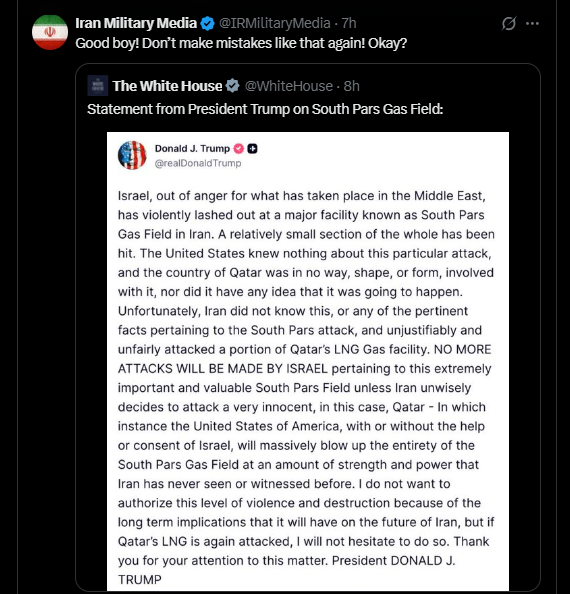 Iranian Military Media Hilarious Reaction To President Trump’s Statement Following Strikes That Hit Gas Production Facilities In Iran And Qatar