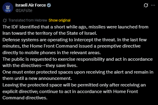 • Israel Defense System Working To Remove Iran Missile Launched Toward The Country, Warns Citizens Against Disobeying Directives.
