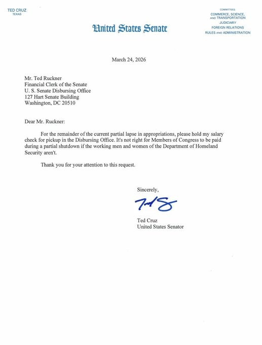 “It’s Not Right For Members Of Congress To Be Paid If The Working Men And Women Of DHS Aren’t”—Sen. Ted Cruz Asked The Financial Clerk To Hold His Salary During DHS Shutdown