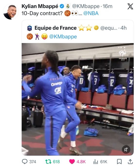 “Okay, ! 💦”— NBA Response To French Footballer Kylian Mbappé After Dunking, Requesting For A 10-Day Contract