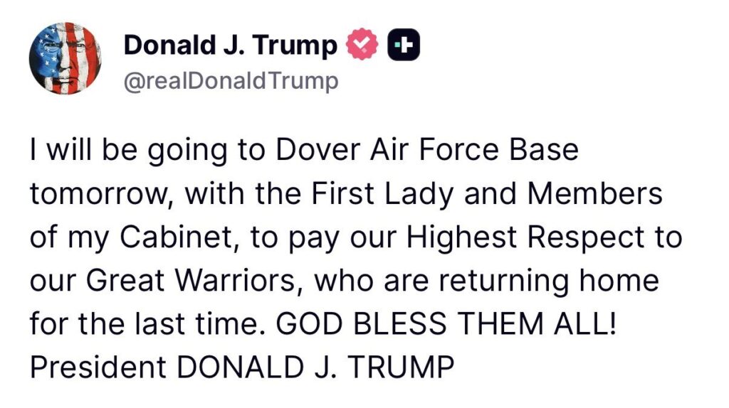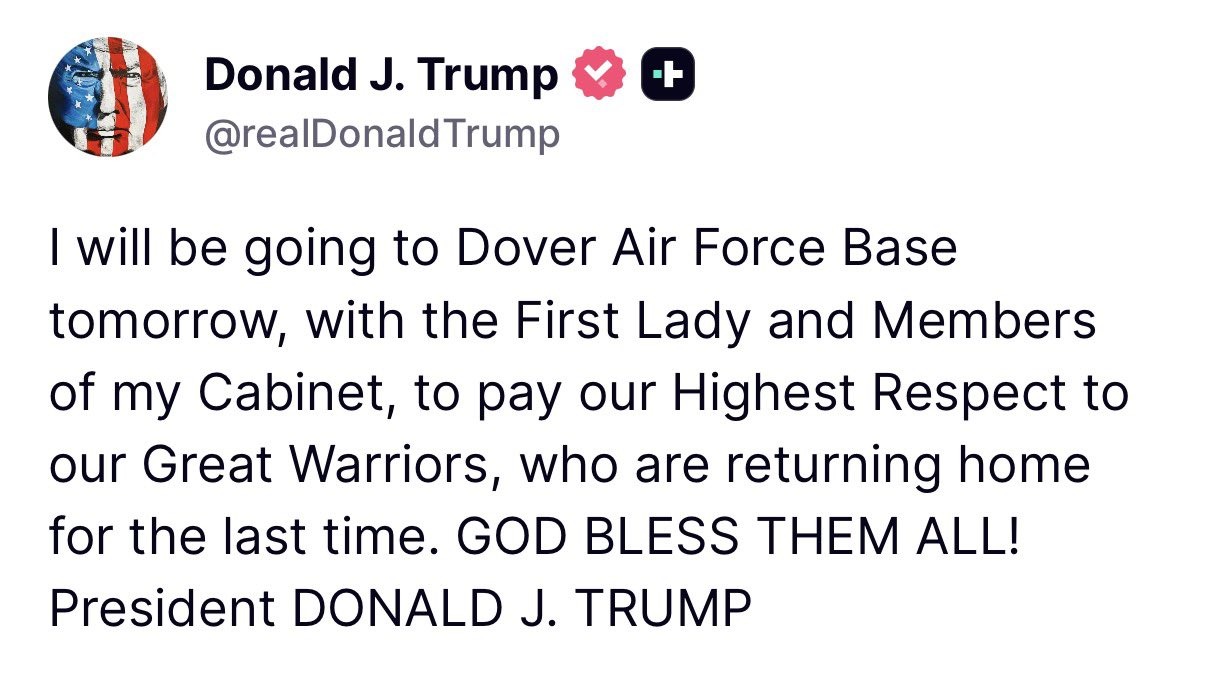 President Trump To Receive At Dover Air Force Base Tomorrow Six Soldiers Killed In Iranian Drone Strike On Kuwait Port.