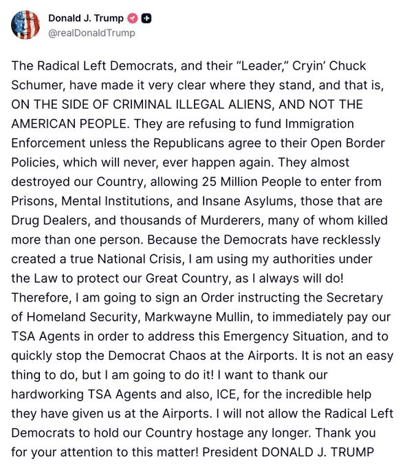 Trump Orders Pay For TSA Agents Amid Shutdown Airport Chaos, Accuses Minority Leader Chuck Schumer Of Standing Of Criminal Illegal Aliens
