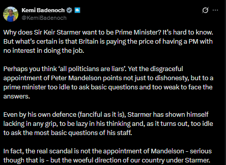 Conservative Leader Kemi Badenoch Advocates For British Prime Minister Keir Starmer’s Resignation, Claims He “No Interest In Doing The Job.”