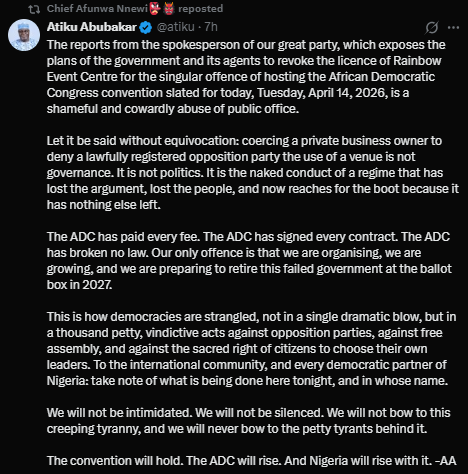 Atiku Abubakar: “Let it be said without equivocation: coercing a private business owner to deny a lawfully registered opposition party the use of a venue is not governance. It is not politics. It is the naked conduct of a regime that has lost the argument, lost the people, and now reaches for the boot because it has nothing else left.
