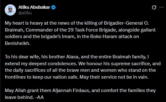 Former Nigerian V.P. Abubakar Reacts To The Killing Of Brigadier-General O. Braimah, Commander Of The 29 Task Force Brigade and his soldiers