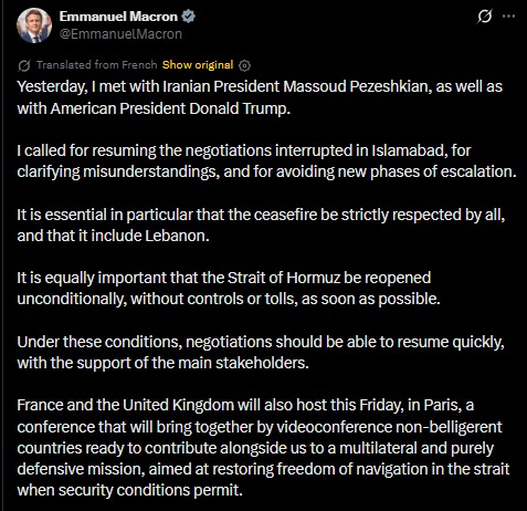 France Calls For Negotiation Resumption Between Iran And U.S, Lay Emphasis On The Importance Of Opening Strait Of Hormuz Unconditionally, Without Controls Or Tolls.