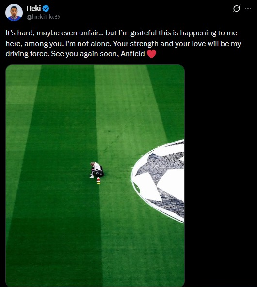 Hugo Ekitike; “It’s hard, maybe even unfair… but I’m grateful this is happening to me here, among you. I’m not alone. Your strength and your love will be my driving force. See you again soon, Anfield ❤️”