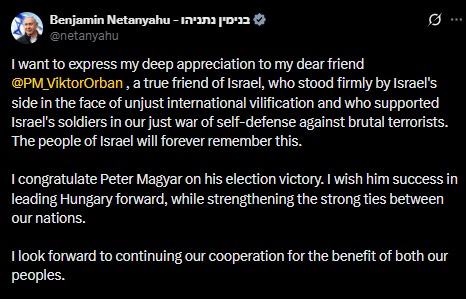 P.M. Benjamin Netanyahu Expresses Gratitude To Hungarian Orbán Viktor, For His Show Of Support To Israel After Losing Parliamentary Election To Peter Magyar