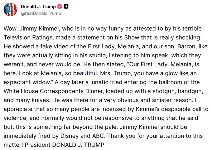 President Trump Calls On ABC To Fire Jimmy Kimmel In The Wake Of The Late-Night Comic Making A Joke In Which He Described The First Lady As Having “The Glow Of An Expectant Widow.”