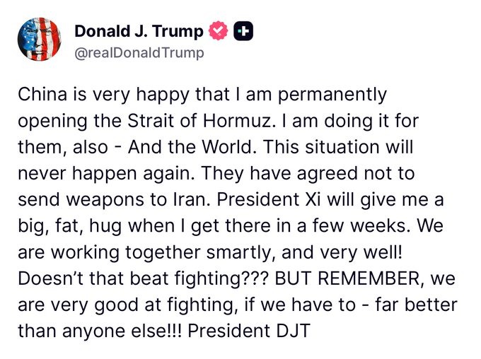 President Trump Claims His Reopening Of Strait Of Hormuz Is For China’s Benefit