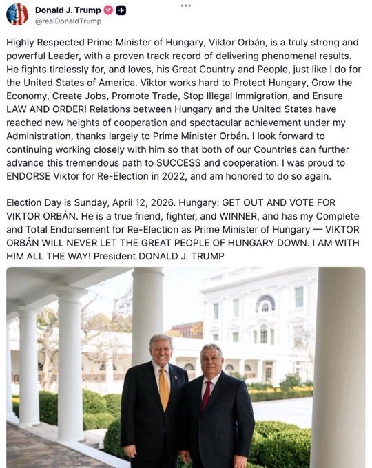 NewsPresident Trump On Hungarian P.M Orbán Viktor, Endorses Him For Another Term00 by thesubstancenewsApril 10, 2026April 10, 2026