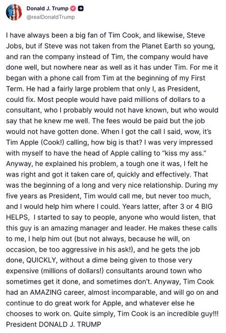 • Trump Discloses That Tim Cook Calls Him At The Beginning Of His First Term As President  To ‘Kiss My Ass’ As The Apple CEO Gears To Step Down In September