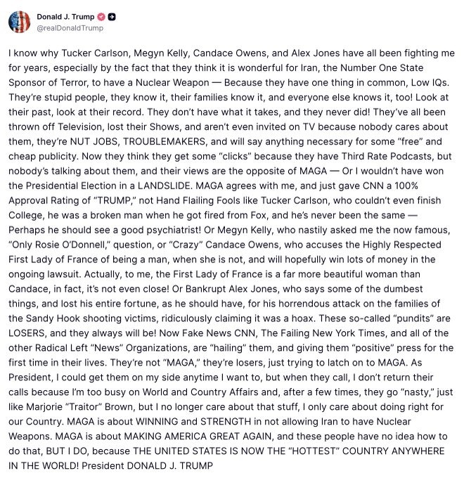 Trump Slams Podcasters Carlson, Kelly, Owens And Jones Claims They Are ‘TROUBLEMAKERS’ With Low IQs Over Cyberbullying France First Lady Macron’s For Her Look, Blast CNN And NYT.