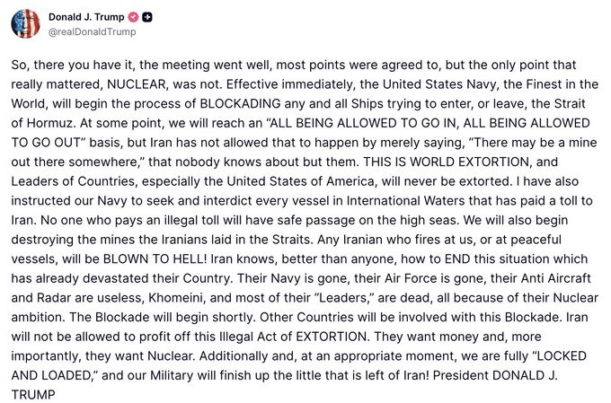 US Military To Blockade Ships Trying To Enter Or Leave Strait Of Hormuz, After Ceasefire Talk Ended Without Agreement, Trump Says America Will Never Be Extorted