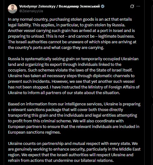 Zelenskyy Accuses Russia Of Theft And Israel Of Buying Stolen Goods, Ukraine Ready To Sanctions Package That Will Cover Those Transporting The Goods And Legal Entities Attempting To Profiting Them.